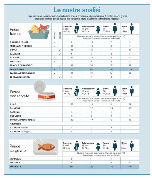 «Grazie a questo studio – spiega Emanuela Bianchi, coordinatrice del settore Alimentazione di Altroconsumo – abbiamo verificato la presenza di questa sostanza tra le tipologie di pesci maggiormente acquistati dagli italiani, così da aiutare i consumatori a non superare la soglia di assunzione indicata dall’Autorità europea per la sicurezza alimentare (Efsa), fissata in 1,3 microgrammi per chilogrammo di peso corporeo».