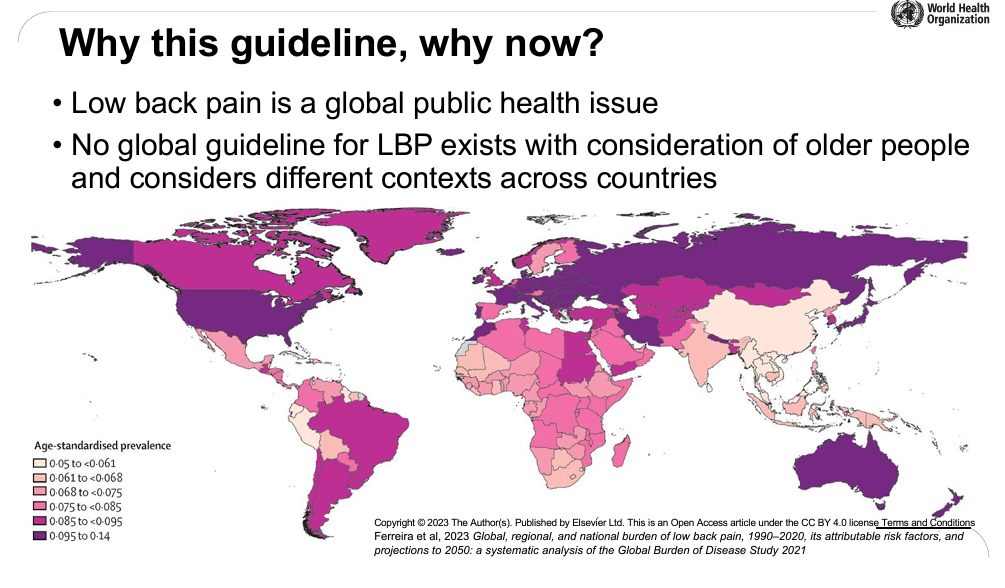 Anche dall’Organizzazione Mondiale della Sanità arrivano segnali importanti attraverso la recente pubblicazione di nuove linee guida per gli interventi non chirurgici sul ‘low back pain’ cronico, il mal di schiena, sia negli adulti che nelle persone più avanti con l’età. L’Italia è uno dei paesi con una prevalenza marcata del low back pain, il mal di schiena, nelle fasce di età più adulte, al pari di Stati Uniti, Australia, Russia, Iran e quasi tutta l’Europa, come si evince dalla mappa dell’OMS (immagine qui di seguito), che suddivide gli interventi necessari in cinque classi: l’educazione, ovvero l’apprendimento e la consapevolezza da parte del paziente; le terapie fisiche (gli esercizi), le terapie psicologiche, le terapie con multi-componenti e l’impiego di farmaci. Al tempo stesso, le linee guida dell’OMS raccomandano anche le azioni da non fare o da fare con cautela nell’ambito di interventi di cure routinarie: trazioni, ultrasuoni, la stimolazione elettrica transcutanea nervosa (TENs); l’utilizzo di medicinali analgesici a base di oppioidi, antidepressivi, anticonvulsivi; la perdita di peso farmacologica.
