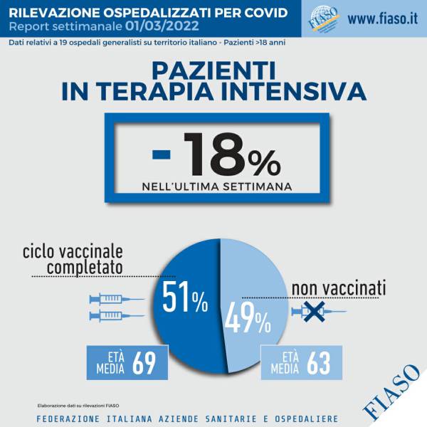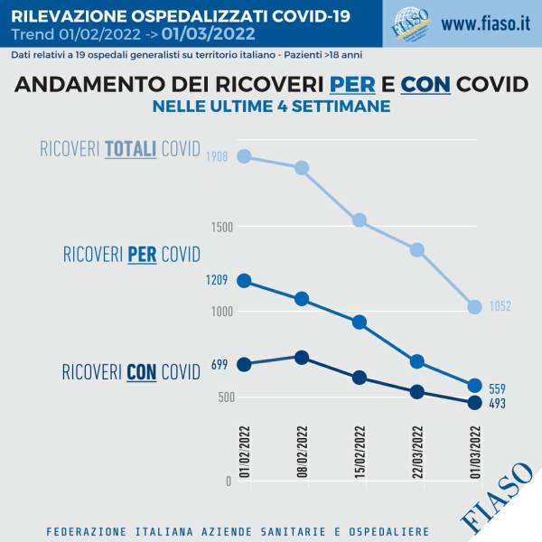 I ricoveri Covid scendono del 21,6% in una settimana. Si tratta del calo più netto registrato nell’ultimo mese negli ospedali sentinella monitorati da Fiaso. La curva delle ospedalizzazioni, infatti, ha cominciato a scendere il 1° febbraio con una lieve riduzione del 3% e per tutto il mese è stata evidenziata una decrescita graduale fino al picco registrato oggi.
