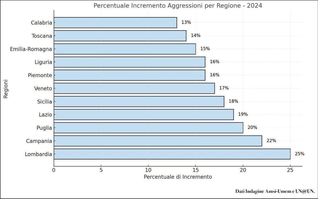 Incrementi percentuali delle aggressioni per regione nel 2024 (classifica delle prime 10 regioni):