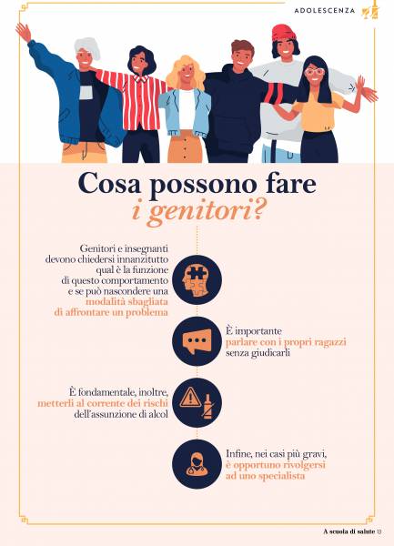«Durante l’adolescenza – spiega Stefano Vicari, responsabile di Neuropsichiatria del Bambino Gesù – l’uso di alcol diventa un “facilitatore”, appare funzionale al superamento di difficoltà e paure tipiche di quell’età, a integrarsi nel gruppo dei pari, ma può facilmente degenerare in abuso e dipendenza. In questo caso il ragazzo mostra segni di malessere, caratterizzati da una ricerca continua di alcol che interferisce con le attività quotidiane e con la messa in atto di comportamenti pericolosi». In situazioni del genere, il suggerimento per i genitori è di parlare con i propri figli, senza giudicarli, per capire cosa li spinge a bere; di metterli al corrente dei rischi dell’assunzione di alcol e, nei casi più gravi, di rivolgersi a uno specialista.
