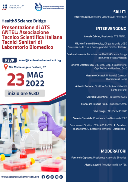 Il 23 maggio sarà presentata l’Associazione Tecnico Scientifica Italiana dei Tecnici di Laboratorio Biomedico – ATS Antel presso la Sala Conferenze del Centro Studi Americani di Roma .L’Associazione Tecnico Scientifica ANTEL
