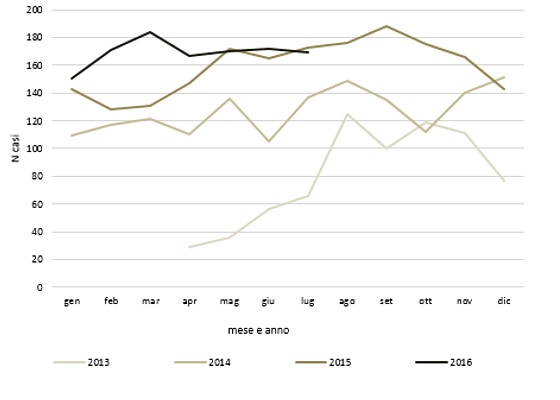 FIG. 1 – Distribuzione dei casi per mese e anno, 1 aprile 2013 – 31 luglio 2016