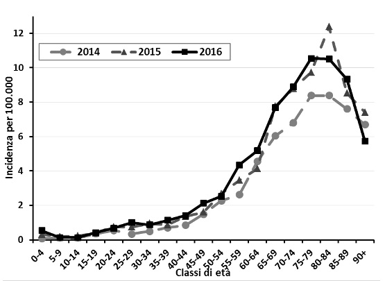 L’incidenza nel 2016 è risultata 3/100.000 abitanti, ma sale a oltre 8/100.000 nell’anziano.
