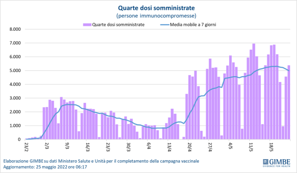 Al 25 maggio (aggiornamento ore 06.17) sono state somministrate 241.427 quarte dosi quarte dosi, con una media mobile di 5 mila somministrazioni al giorno. In base alla platea ufficiale (n. 791.376), aggiornata al 20 maggio, il tasso di copertura nazionale per le quarte dosi è del 30,5% con nette differenze regionali: dal 5,6% del Molise al 100% del Piemonte.