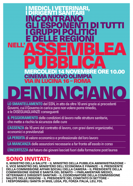 I temi al centro dell’assemblea pubblica sono riassunti nel manifesto preparato per l’occasione dai sindacati: lo smantellamento del Servizio Sanitario Nazionale, il peggioramento delle condizioni di lavoro di medici e dirigenti sanitari, l’assenza da 10 anni del contratto, la mancanza delle assunzioni, la perdita di valore economico e professionale del lavoro, l’incertezza del futuro dei giovani lasciati fuori dalla formazione post laurea. Tra gli invitati del mondo delle istituzioni, i ministri della Salute e della Pubblica Amministrazione, i sottosegretari alla Salute e all’Economia, il coordinatore delle Regioni e il presidente del Comitato di settore, i presidenti delle Commissioni sanità di Camera e Senato, i parlamentari medici, veterinari e dirigenti sanitari e i responsabili sanità dei partiti. Conferme dei partecipanti ancora non si hanno.