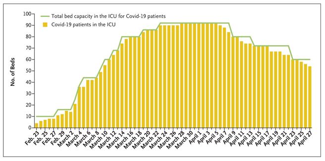 Il contributo inizia ripercorrendo le tappe dell’esplosione dell’epidemia da Coronavirus dopo i primi, noti focolai di Alzano Lombardo e Nembro: i primi casi nell’ospedale di Alzano si sono registrati il 23 di febbraio, ma il lockdown della provincia non si è verificato prima dell’8 marzo. «Nel frattempo – spiegano i dottori – il virus aveva però contagiato migliaia di persone» e la capacità dei presidi sanitari bergamaschi veniva progressivamente saturata. Entro il 28 di marzo, i pazienti Covid-19 avevano occupato 498 dei 779 posti a disposizione del “PapaGio”, come viene affettuosamente chiamato il presidio sanitario bergamasco: «Di questi, 92 sono stati avviati alla terapia intensiva e 12 alla sezione dedicata della subintensiva». Entro poche settimane, «il 70% dei medici di ruolo è stato assegnato alle unità Covid-19», ricevendo un percorso di peer education che ha coinvolto «più di 1500 persone in una settimana». Intanto, il servizio di terapia intensiva veniva riconfigurato e potenziato, con un decollo di posti letto a disposizione che in 20 giorni è riuscito ad aggiungere oltre 100 postazioni operative.
