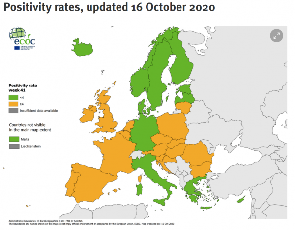 Nell’ultima mappa è esplicitato il tasso di positività, ovvero il rapporto testati/positivi che, per essere in una situazione sicura, non dovrebbe andare oltre il 4%. Per il momento, secondo le rilevazioni del 16 ottobre, l’Italia rientra nella zona verde inferiore al 4% con la Germania, la Danimarca e la Scandinavia. In giallo, con un tasso superiore o uguale, Francia, Gran Bretagna e Spagna.