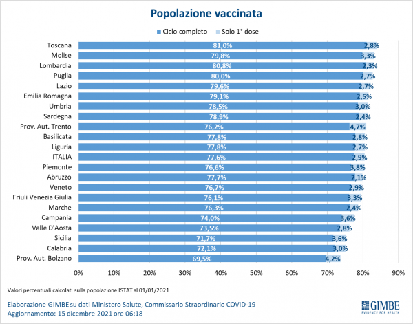 Al 15 dicembre sono state somministrate 12.563.534 terze dosi. La media mobile a 7 giorni si è stabilizzata intorno alle 400 mila somministrazioni al giorno. In base alla platea ufficiale il tasso di copertura nazionale per le terze dosi è del 61,4% con nette differenze regionali, dal 45,7% della Sicilia al 71,2% della Toscana.
