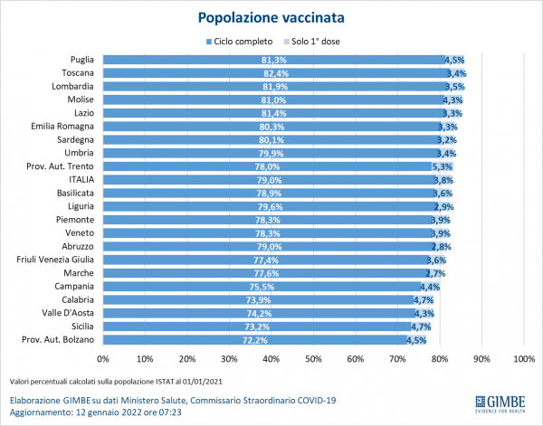 Le coperture con almeno una dose di vaccino sono molto variabili nelle diverse fasce d’età (dal 98% degli over 80 al 18,4% della fascia 5-11), così come sul fronte dei richiami, che negli over 80 hanno raggiunto il 77,8%, nella fascia 70-79 il 70,1% e in quella 60-69 anni il 61,9%. Nella settimana 3-9 gennaio 2022 si registrano 483.512 nuovi vaccinati (+62,1%) rispetto ai 298.253 della settimana precedente. L’aumento riguarda in particolare la fascia 5-11 (n. 267.412; +53,3%) e quella 12-19 (n. 61.778; +65,5%), mentre la recente introduzione dell’obbligo vaccinale per gli over 50 al momento non ha sortito grandi effetti visto che in questa fascia anagrafica i nuovi vaccinati sono solo 73.690. All’11 gennaio rimangono 8,61 milioni di persone senza nemmeno una dose di vaccino: 2,98 milioni appartengono alla fascia 5-11 anni, oltre 800 mila alla fascia 12-19 e 2,21 milioni sono over 50 ad elevato rischio di malattia grave e ospedalizzazione.