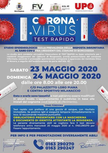L’appuntamento per tutti i borgosesiani che vorranno sottoporsi al test è fissato per il 23 ed il 24 maggio: tutto è già organizzato, la popolazione è stata suddivisa in ordine alfabetico, e i test si eseguiranno in due postazioni, una al Palazzetto Loro Piana e l’altra al Centro Sportivo Milanaccio; il primo giorno saranno esaminati i cittadini i cui cognomi iniziano con A fino a quelli che iniziano con K, nella seconda giornata dalla L alla Z. I test sierologici si effettuano in modo rapido, con il prelievo di una goccia di sangue e danno risultato immediato. Chi poi dovesse risultare positivo alle IgM verrà immediatamente sottoposto a tampone.