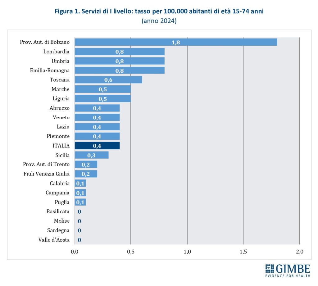 L’assistenza alle persone con dipendenze patologiche rientra tra i Livelli Essenziali di Assistenza (LEA) e viene garantita attraverso un sistema che coinvolge SerD pubblici, strutture private e realtà del privato sociale. Tuttavia, la rete resta fragile e irregolare.Nel 2024 risultano censiti 198 servizi di I livello, di cui il 77% gestiti dal privato sociale. Il tasso medio nazionale è di 0,4 servizi ogni 100.000 abitanti, ma si passa da 1,8 nella Provincia autonoma di Bolzano a 0,1 in Calabria, Campania e Puglia. In Basilicata, Molise, Sardegna e Valle d’Aosta non è presente alcun servizio.