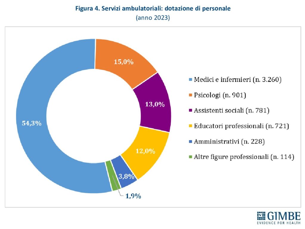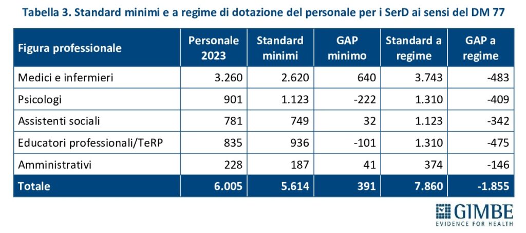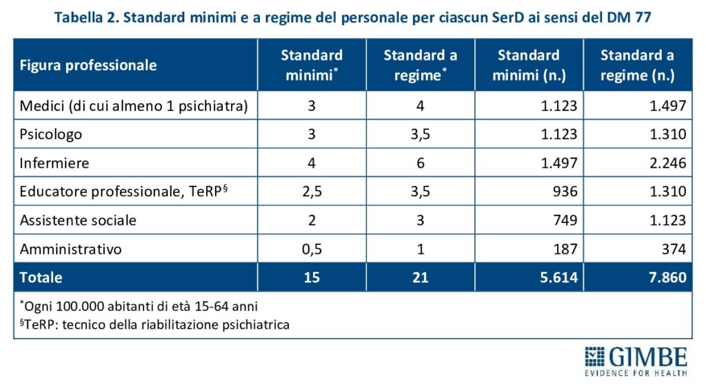 Il DM 77 definisce la presenza di un SerD ogni 80.000-100.000 abitanti e stabilisce gli standard di personale minimo e a regime per garantire un’assistenza adeguata. Secondo i calcoli della Fondazione GIMBE, per rispettare questi standard sarebbero necessari da 5.600 a 7.800 operatori, ma ne risultano attivi solo 6.005: mancano dunque quasi 1.900 professionisti.