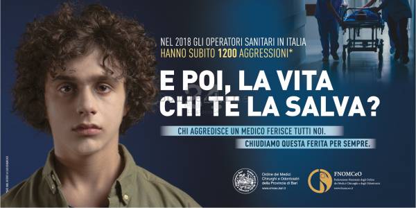 Una nuova campagna per sensibilizzare l’opinione pubblica contro le violenze agli operatori sanitari che non accennano a diminuire. La lancia l’Ordine dei medici di Bari, con il patrocinio di Fnomceo (Federazione nazionale degli Ordini dei medici). “Chi aggredisce un medico ferisce tutti noi. Chiudiamo questa ferita per sempre”, recita il copy della campagna, in cui campeggiano in primo piano i volti di tre pazienti – una donna, un uomo e un ragazzo e una domanda, “E poi, la vita chi te la salva?”, che campeggia sui cartelloni pubblicitari affissi da oggi nelle strade del capoluogo pugliese.