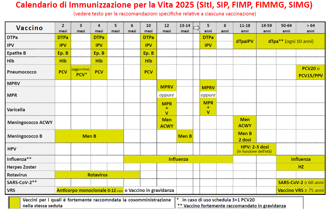 Il Documento, in linea con gli standard europei, è stato redatto sulla base degli ultimi aggiornamenti della letteratura scientifica e rappresenta il contributo di cinque Società scientifiche con più di 50mila Medici e Professionisti sanitari iscritti. Coordinato dal Prof. Paolo Bonanni – Docente di Igiene presso il Dipartimento di Scienze della Salute Università di Firenze – il Board del Calendario per la vita comprende: Società Italiana d’Igiene, Medicina Preventiva e Sanità Pubblica (SItI), Società Italiana di Pediatria (SIP), Federazione Italiana Medici Pediatri (FIMP), Federazione Italiana dei Medici di Medicina Generale (FIMMG) e Società Italiana di Medicina Generale e delle Cure Primarie (SIMG).