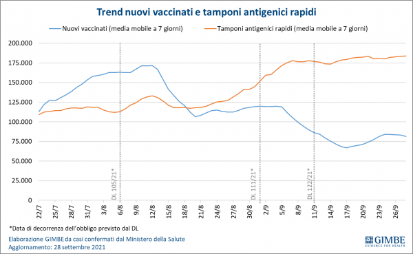 «Sin dal 6 agosto – analizza Gimbe – l’impatto dell’estensione del green pass è molto evidente sui tamponi rapidi, la cui media mobile a 7 giorni è aumentata in un mese del 57,7% passando da 113 mila (6 agosto) a 178 mila (7 settembre) per poi stabilizzarsi. Sui nuovi vaccinati l’effetto Green pass è ancora modesto: dopo un lieve rialzo dopo il 6 agosto, le prime dosi giornaliere sono crollate sino al minimo del 17 settembre (media mobile 66,7 mila), registrando poi una timida risalita e stabilizzandosi intorno a quota 84mila».