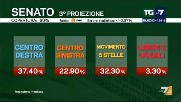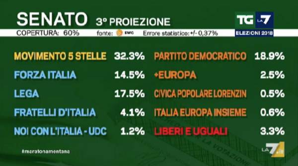 La terza proiezione Swg per La7, relativa al Senato, dice che il M5S è sempre primo partito al Senato: M5S 32.3%; Fi 14.5%; Lega 17.5%; Fdi 4.1%; Noi con l’Italia 1.2%; Pd 18.9%; +eu 2.5%; Civica e popolare 0.5%; Insieme 0.6%; Leu 3.3%; Pap 1.2%; Cp 0.8%; Pdf 0.7.