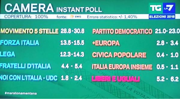 Anche gli exit poll danno in vantaggio il Movimento 5 Stelle. Secondo gli instant poll di SWG rilanciati da La7, il movimento fondato da Beppe Grillo avrebbe tra il 28.8% e il 30.8%. Per il centrodestra Forza Italia e Lega quasi allo stesso livello: gli azzurri sarebbero tra il 13.5 e il 15.5, la Lega di Matteo Salvini tra 12.3 e 14.3%. Fratelli d’Italia tra il 4.4 e il 5.4% mentre Noi con L’Italia – Udc 1,8% – 2,4%. La distribuzione dei seggi conseguente agli exit poll diffusi dalle varie reti tv non consentirebbe ad alcuna coalizione o partito di raggiungere la maggioranza assoluta. In base ai dati elaborati da Quorum per Agi, il centrodestra otterrebbe 257 seggi alla Camera e 123 al Senato, M5s 204 alla Camera e 102 al Senato, il centrosinistra, rispettivamente, 138 e 74, Leu 19 e 10.