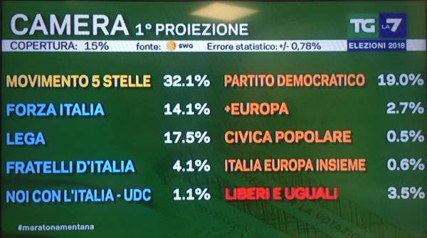 I dati della Camera sembrano confermare quelli del Senato: secondo la prima proiezione Swg per La7 – copertura 15% – relativa alla Camera il M5S è al 32,01%; Forza Italia 14,1%; Lega 17,5%; Fratelli d’Italia 4,1; Pd 19%; Leu 3,5%; Noi con l’Italia Udc 1,1%; +Europa 2,7%; Civica popolare 0,5%; Italia Europa Insieme 0,6%; Potere al popolo 1,6%; Casapound 0,9%; Popolo della famiglia 0,9%.