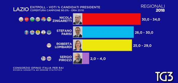Insieme alle politiche si è votato anche per il rinnovo dei consigli regionali di Lazio e Lombardia. Secondo il primo exit poll del Consorzio Opinio Italia per la Rai, alle regionali per la presidenza del Lazio Nicola Zingaretti (centrosinistra) è in testa con il 30-34%, mentre Stefano Parisi (centrodestra) è al 26-30%%. Roberta Lombardi (M5s) è al 25-29% e Sergio Pirozzi (lista civica) è al 2-4%. In Lombardia è in vantaggio Attilio Fontana (centrodestra) al 38-42%; Giorgio Gori (centrosinistra) è al 31-35%%. Dario Violi (M5s) è al 17-21%% e Onorio Rosati (Leu) al 2-4 %.