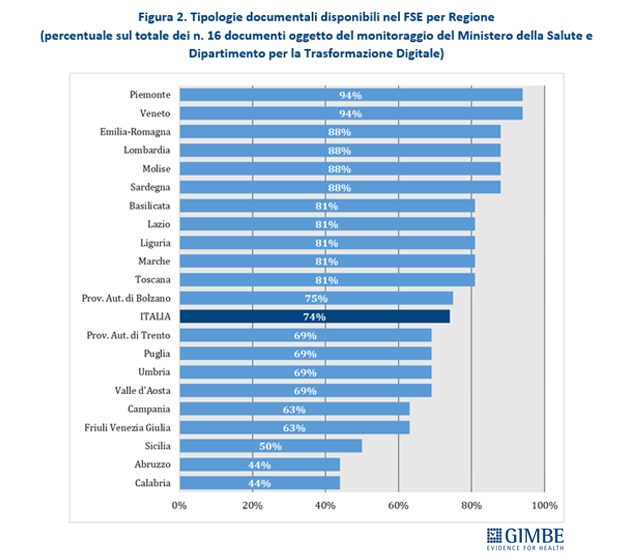 Complessivamente, a livello nazionale il FSE mette a disposizione degli utenti il 68% dei documenti monitorati sul portale del FSE 2.0 e previsti dal decreto. Nessuna Regione alimenta il FSE con tutte le tipologie documentali previste dal DM: si va dal 93% del Piemonte e del Veneto al 40% di Abruzzo e Calabria (figura 2).