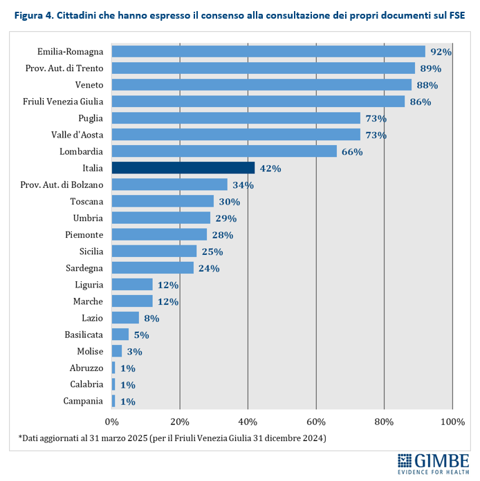 Consenso alla consultazione. Al 31 marzo 2025 (per il Friuli Venezia Giulia i dati sono aggiornati al 31 dicembre 2024), a livello nazionale solo il 42% dei cittadini ha espresso il consenso alla consultazione dei propri dati sanitari da parte dei medici. Ma il divario tra le Regioni è enorme: si passa dall’1% in Abruzzo, Calabria e Campania al 92% in Emilia-Romagna. Tra le Regioni del Sud, solo la Puglia (73%) supera la media nazionale (figura 4).