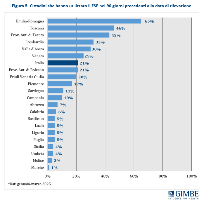 “Fornire il consenso è il primo passo per accedere ai benefici del FSE – sottolinea Cartabellotta – ma serve un grande sforzo informativo e culturale per rafforzare la fiducia dei cittadini, superando i timori legati alla protezione dei dati personali”. Utilizzo del FSE. Tra gennaio e marzo 2025, appena il 21% dei cittadini ha consultato almeno una volta il proprio FSE, considerando esclusivamente chi ha avuto almeno un documento caricato. Anche in questo caso le disparità regionali sono marcate: si va dall’1% delle Marche al 65% dell’Emilia-Romagna (figura 5).