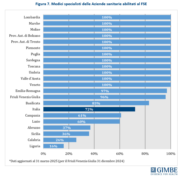 Utilizzo da parte di medici specialisti. Al 31 marzo 2025 (31 dicembre 2024 per il Friuli Venezia Giulia), il 72% dei medici specialisti delle Aziende sanitarie risulta abilitato alla consultazione del FSE. Anche in questo caso, le differenze tra Regioni restano marcate. Dodici Regioni e Province Autonome hanno raggiunto il 100% di abilitazioni: Lombardia, Marche, Molise, Province Autonome di Bolzano e Trento, Piemonte, Puglia, Sardegna, Toscana, Umbria, Valle d’Aosta e Veneto. Sotto la media nazionale si collocano Campania (61%), Lazio (60%), Abruzzo (37%), Sicilia (36%) e Calabria (26%). Fanalino di coda la Liguria, con appena il 16% di medici specialisti abilitati alla consultazione del FSE (figura 7).