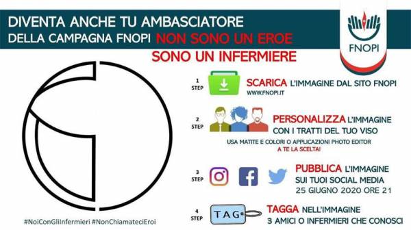 «Sulle finestre di ogni casa – spiega la Fnopi in un comunicato – verrà apposto e divulgato attraverso i social network di ogni utente il simbolo della campagna. Ogni persona lo potrà personalizzare e taggare 3 persone per supportare la challenge attraverso i propri canali social e inserendo il link della piattaforma e due hashtag per veicolare i post ovvero #NonChiamateciEroi #NoiConGliInfermieri».
