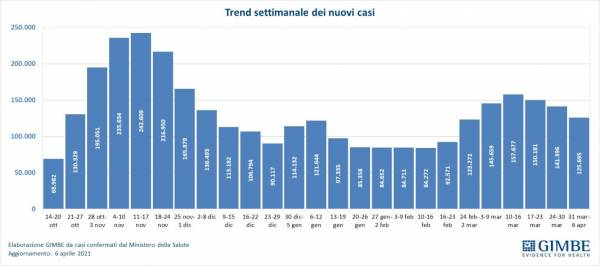 Il monitoraggio indipendente della Fondazione GIMBE rileva nella settimana 31 marzo-6 aprile 2021 una diminuzione dei nuovi casi (125.695 vs 141.396) (figura 1) rispetto alla precedente, legata in parte alla netta riduzione dell’attività di testing.