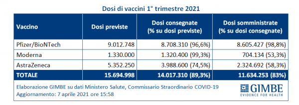 Al 7 aprile (aggiornamento ore 15.58) risultano consegnate alle Regioni 14.017.310 dosi, pari al 89,3% delle dosi previste per il 1° trimestre 2021. In dettaglio: