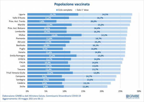 Al 5 maggio (aggiornamento ore 6.11), il 25,5% della popolazione ha ricevuto almeno una dose di vaccino (n. 15.200.724) e il 10,9% ha completato il ciclo vaccinale (n. 6.522.822), con modeste differenze regionali: dal 28,2% di vaccinati con almeno una dose della Liguria al 21,6% della Sicilia nella settimana 26 aprile-2 maggio si registra, rispetto alla precedente, un incremento delle somministrazioni del 20% con una media mobile a 7 giorni che raggiunge quota 432.860 somministrazioni/die (vs 361.326 del 27 aprile). «il progressivo incremento delle consegne – commenta Gili – insieme alle scorte disponibili renderebbero finalmente possibile mantenere costanti le 500.000 somministrazioni al giorno, obiettivo raggiunto per ora solo con l’exploit del 29 e 30 aprile». relativamente ai target fissati dal commissario figliuolo per la settimana 22-29 aprile emergono marcate differenze regionali: 9 regioni hanno superato il target assegnato, mentre 12 sono rimaste sottosoglia.