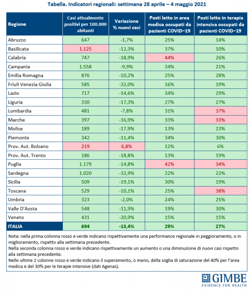 «Con il progressivo calo dei nuovi casi – afferma Renata Gili, responsabile ricerca sui servizi sanitari della fondazione Gimbe – continua a ridursi la pressione sugli ospedali, dove le curve dei posti letto occupati in area medica e terapia intensiva continuano a scendere da 4 settimane consecutive». Nel dettaglio: