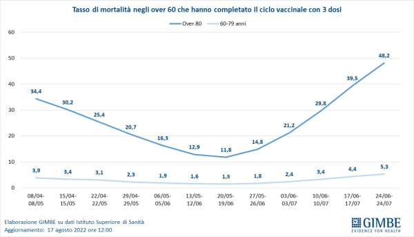 «Secondo i dati pubblicati dall’ultimo report dell’Istituto superiore di sanità – si legge nel report Gimbe – i relativi ai decessi di persone con diagnosi di Covid tra il 24 giugno e il 24 luglio 2022, il tasso grezzo di mortalità per 100.000 persone è molto più elevato tra i non vaccinati che tra i vaccinati con tre dosi: 19,1 contro 5,3 per la fascia 60-79 anni e 327,2 contro 48,2 per gli over 80. Tuttavia, a fronte di questa efficacia molto elevata, negli over 60 che hanno completato il ciclo vaccinale con 3 dosi si rileva un progressivo aumento del tasso grezzo di mortalità: in particolare, dopo aver toccato il valore mimino per i deceduti con diagnosi di Covid nel periodo 20 maggio-19 giugno è aumentato in poco più di un mese da 1,5 a 5,3 nella fascia 60-79 anni (+253%) e da 11,8 a 48,2 negli over 80 (+309%)».