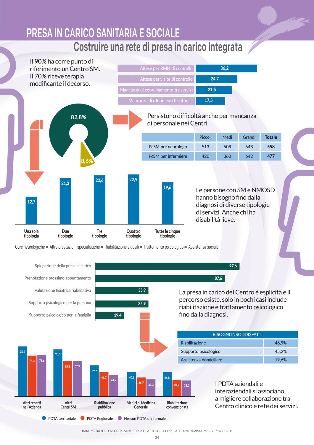 Prevedere esplicitamente i Centri clinici della sclerosi multipla e patologie correlate nei piani di riorganizzazione delle reti ospedaliere nazionali e regionali. Ancora, inserire la sclerosi multipla e patologie correlate tra le malattie a cui il Piano Nazionale Cronicità dedica specifica attenzione, quali condizioni ad altra complessità e ad alto impatto per le persone e il Paese e strutturare la presa in carico dei pazienti integrata con quella ospedaliera ai sensi del Dm 77/2022, anche con riferimento alle reti di prossimità di cui alla Missione 6 del Pnrr (Centrali operative territoriali, Case di Comunità, Ospedali di Comunità). Poi, assicurare la piena attuazione dei nuovi Lea, di cui al Decreto Tariffe, anche con riferimento alle prestazioni necessarie per la presa in carico della sclerosi multipla, inclusa la riabilitazione e gli ausili, nonché i test di genotipizzazione necessari per la scelta del trattamento. Sono solo alcune delle trenta proposte concrete per l’Agenda del Paese a partire dalla esperienza di vita delle persone con la malattia, raccolte nel Barometro della Sclerosi multipla e patologie correlate 2024 presentato questa mattina dall’Associazione italiana sclerosi multipla (Aism) alla Camera dei Deputati in occasione della Giornata mondiale della Sclerosi multipla.