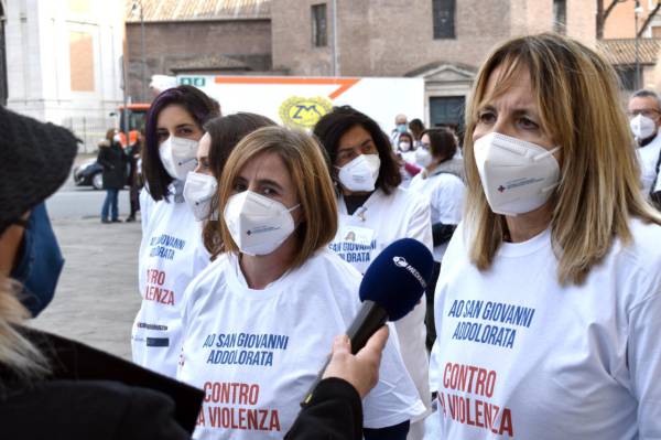 Immobili, in piazza S. Giovanni in Laterano, come a volte ti costringe la paura davanti ad una aggressione “gratuita” da parte di chi stai assistendo e curando. Sono i medici, gli infermieri, gli operatori sociosanitari, i volontari e, anche il personale amministrativo, dell’Ospedale san Giovanni Addolorata di Roma per una manifestazione simbolica in occasione della prima “Giornata nazionale contro la violenza agli operatori sanitari e socio sanitari” che si celebrerà domani 12 marzo e istituita dal Ministero della Salute.