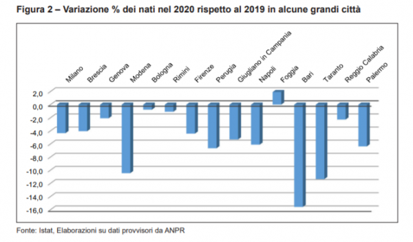 Era successo già con Chernobyl, quando la nube tossica aveva fatto scendere drammaticamente le nascite nel 1987 per paura degli effetti. Dunque un calo in quei mesi è atteso. «Un valido indizio in tal senso viene fornito da un resoconto provvisorio su un insieme di quindici grandi città per le quali si ha la disponibilità di un dato anagrafico completo e attendibile per l’intero anno 2020 (Figura 2). Nell’ambito di tale insieme, che aggrega circa 6 milioni di residenti e ha dato luogo nel 2019 al 10,6% dei nati in Italia, la frequenza di eventi nel corso del 2020 è diminuita mediamente del 5,21%». Con un calo medio del 3,25% nei primi dieci mesi e un vertiginoso 8,21 a novembre che arriva a un 21,63% a dicembre.