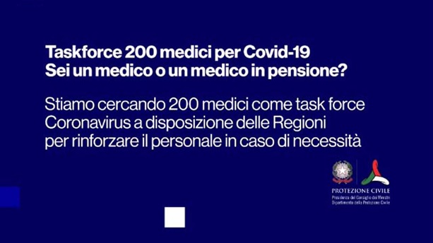 Nello spot si lancia un appello a candidarsi per dare supporto agli ospedali più colpiti. Nel bando della Protezione Civile si specifica che si cercano in particolare specialisti in anestesia e rianimazione, malattie infettive, malattie dell’apparato respiratorio e medicina e chirurgia d’accettazione e urgenza. Alla manifestazione di interesse – si specifica ancora nel bando – non possono partecipare i dipendenti pubblici e privati operanti nel settore sanitario e socio-sanitario in ambito nazionale, al fine di non pregiudicare i livelli di servizio attuali.