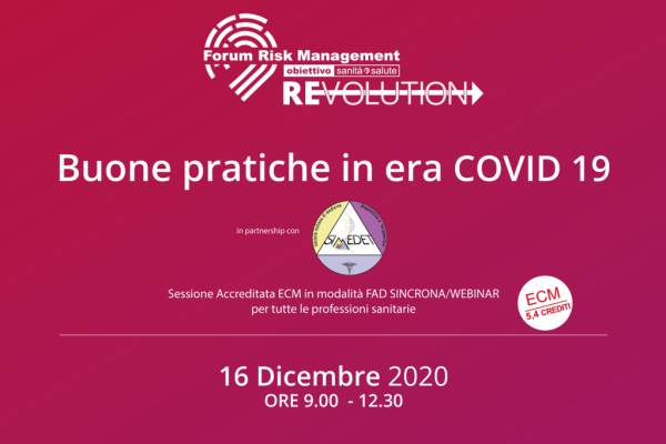 Anche quest’anno la SIMEDET, Società italiana di Medicina diagnostica e terapeutica, sarà presente al consueto appuntamento al Forum Risk Management che si terrà ad Arezzo dal 15 al 18 dicembre 2020. Presenza che si concretizza attraverso uno spazio virtuale e una sessione scientifica, martedì 16 dicembre dalla 9.00 alle 12.30, accreditato ECM in modalità FAD SINCRONA/WEBINAR rivolto a tutte le professioni sanitarie. Il filo conduttore dell’evento sono “Le buone pratiche in era COVID” che coinvolgono sia i professionisti sanitari che i cittadini allo scopo di garantire la sicurezza del paziente.