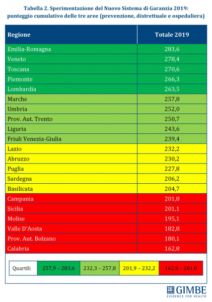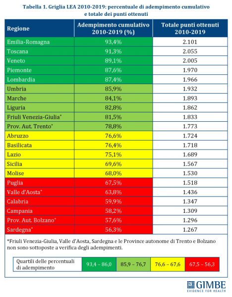 «Si tratta di una vera e propria “pagella” per la sanità – afferma Nino Cartabellotta, Presidente della Fondazione GIMBE che permette di identificare Regioni promosse (adempienti), pertanto meritevoli di accedere alla quota di finanziamento premiale, e bocciate (inadempienti)». Le Regioni inadempienti sono sottoposte ai Piani di rientro, strumento che prevede uno specifico affiancamento da parte del Ministero della Salute che può sfociare sino al commissariamento della Regione. Non sono sottoposte alla verifica degli adempimenti: Friuli Venezia-Giulia, Sardegna, Valle D’Aosta e le Province autonome di Trento e di Bolzano.