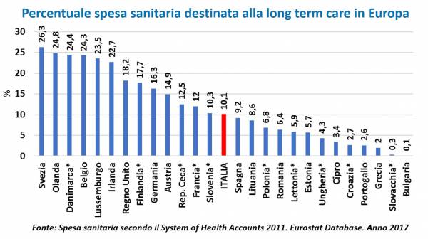 Peccato, però, che nel frattempo il sistema ‘resta al palo’ nell’organizzazione di una rete capillare e sostenibile di servizi sul territorio, a partire dalle cure domiciliari: siamo il fanalino di coda in Europa per quanto riguarda la Long-Term Care, alla quale destiniamo poco più del 10% della spesa sanitaria – a fronte di percentuali che superano il 25% nei Paesi del Nord Europa –, pari a circa 15 miliardi di euro. Di questi, solo 2,3 miliardi (l’1,3% della spesa sanitaria totale) sono destinati all’erogazione di cure domiciliari, con un contributo a carico delle famiglie di circa 76 milioni di euro.