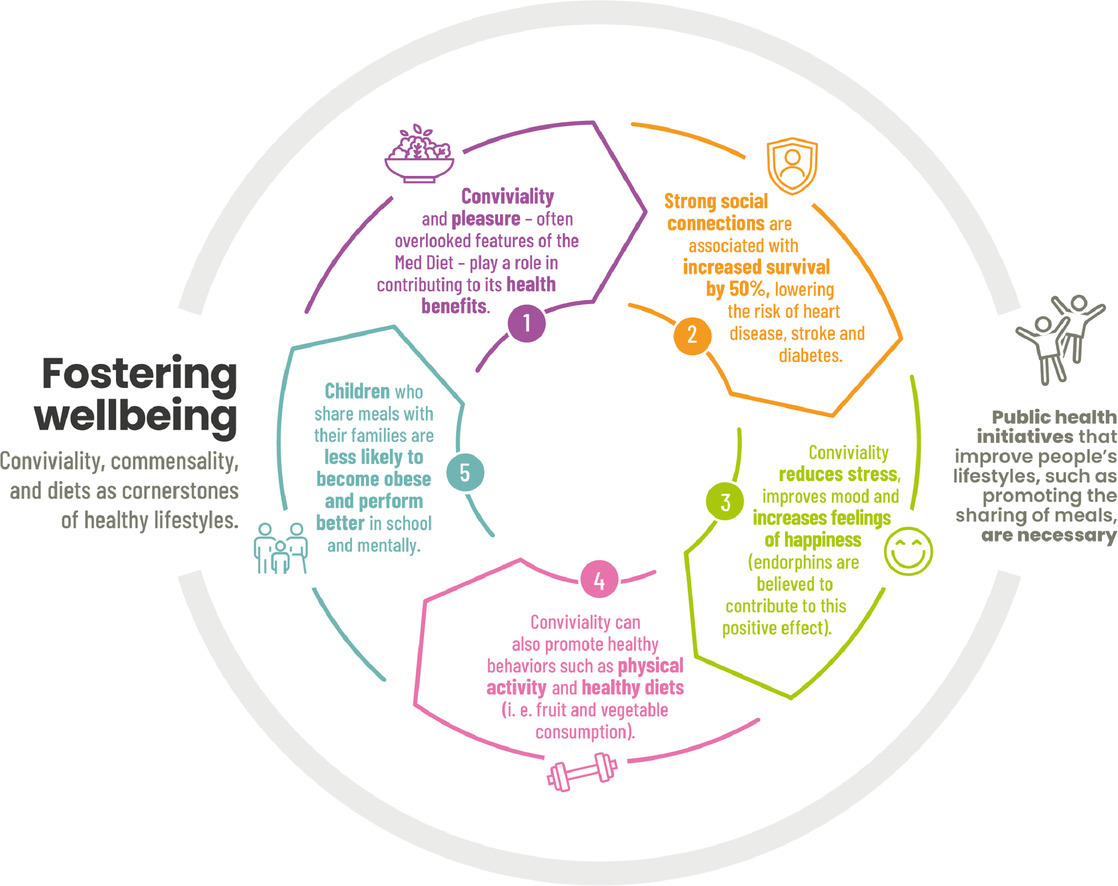 Convivialità e alimentazione sono, dunque, dei pilastri sui cui si fondano i corretti stili di vita sani, cosi mostrato nel seguente grafico, pubblicato dagli autori della ricerca: