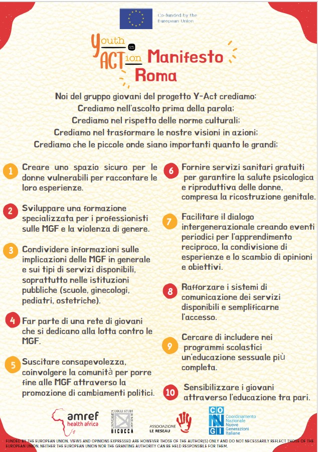 Si chiama ‘Manifesto per il cambiamento’ ed è un documento simbolico che riassume l’impegno dei giovani attivisti e delle comunità per prevenire e contrastare le mutilazioni genitali femminili (Mgf). Si tratta dell’atto conclusivo del progetto Y-Act (Youth in Action for Change) per il territorio di Roma, un’iniziativa co-finanziata dalla Unione Europea (Cerv – Daphne) e promossa da Amref Health Africa Italia in collaborazione con l’Associazione Le Réseau, il Coordinamento Nazionale Nuove Generazioni Italiane (Conngi) e l’Università di Milano Bicocca. In Europa oltre 600mila donne hanno già vissuto la pratica delle mutilazioni genitali femminili, e altre 180mila ragazze sono a rischio ogni anno.