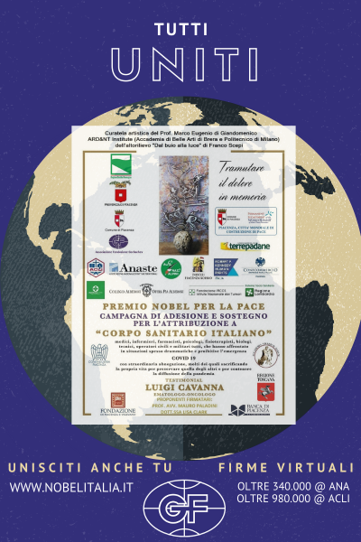 Un grande globo con al centro tutte le adesioni e lo slogan “Tramutare il dolore in memoria”. La Fondazione Gorbachev rinnova la veste grafica del volantino della Campagna per far assegnare il Premio Nobel per la Pace al Corpo sanitario italiano che vede come testimonial l’oncologo piacentino Luigi Cavanna, pioniere delle cure a domicilio durante la fase più critica della pandemia.