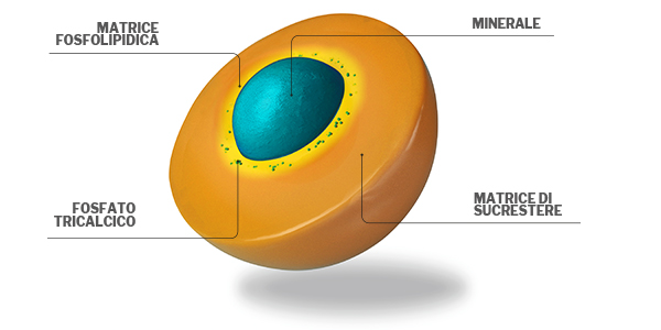 La tecnologia Sucrosomiale® permette di avvolgere i minerali in una matrice di fosfolipidi ed esteri saccarici degli acidi grassi; questa struttura prende il nome di Sucrosoma®(figura sotto), il quale permette un elevato assorbimento e un’ottima tollerabilità gastrointestinale, superando i limiti legati all’integrazione convenzionale di questi minerali.