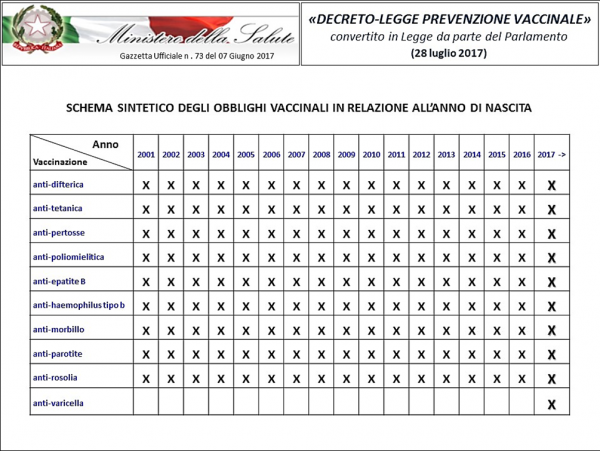 • obbligatorie “sino a diversa successiva valutazione” quali la vaccinazione: anti-morbillo, anti-rosolia, anti-parotite, anti-varicella.  Per una o più di queste ultime vaccinazioni il Ministero della Salute, sulla base della verifica dei dati epidemiologici e delle coperture vaccinali eventualmente raggiunte, decorsi tre anni dalla data di entrata in vigore della legge, potrà disporre la cessazione della stessa obbligatorietà.