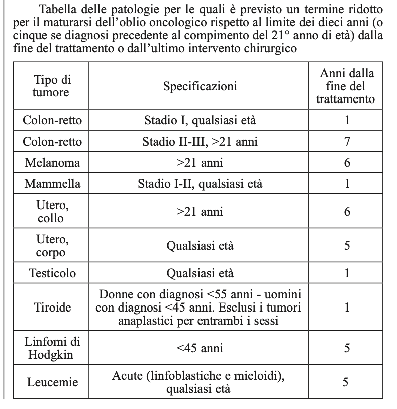 La legge per l’oblio oncologico ha il suo primo decreto attuativo, messo a punto dal ministero della Salute. Il provvedimento, pubblicato in Gazzetta ufficiale il 24 aprile, definisce l’elenco delle patologie oncologiche per le quali è previsto un termine ridotto per maturare il diritto all’oblio rispetto al limite dei 10 anni (o 5 anni, se la diagnosi è precedente al compimento del ventunesimo anno di età) dalla fine del trattamento o dall’ultimo intervento chirurgico.