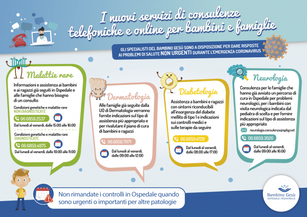 «Due le linee telefoniche per le malattie rare: lo 06 6859 2537, attivo dal lunedì al venerdì dalle 15:00 alle 16:00, è rivolto a bambini e ragazzi con condizioni genetiche e malattie rare non diagnosticate; lo 06 6859 4975, dal lunedì al venerdì dalle 10:00 alle 11:00, ai pazienti con condizioni genetiche e malattie rare diagnosticate. I servizi sono rivolti sia ai bambini e ai ragazzi già seguiti in Ospedale, sia alle famiglie che hanno bisogno di un consulto con lo specialista in malattie rare nel periodo in cui non è possibile accedere con le consuete modalità all’ambulatorio dedicato in Ospedale».