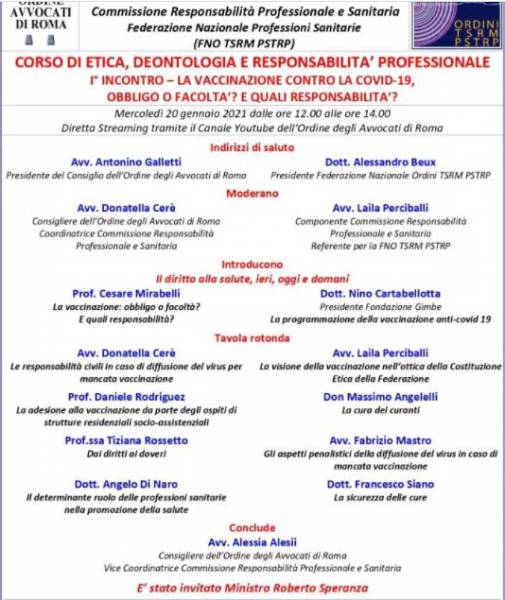 A seguire la tavola rotonda: il Consigliere Avvocato Donatella Cerè parlerà delle responsabilità civili in caso di diffusione del virus per mancata vaccinazione, l’avvocato Fabrizio Mastro dei risvolti penalistici. Il Prof. Daniele Rodriguez del consenso alla vaccinazione da parte degli ospiti di strutture socio-assistenziali, la Prof.sssa Tiziana Rossetto parlerà non solo dei diritti, ma anche dei doveri ai tempi della pandemia, il dott. Angelo di Naro porrà l’attenzione sul “determinante ruolo delle professioni sanitarie nella promozione della salute”, Don Massimo Angelelli parlerà della “cura dei curanti”, e Fabrizio Siano della sicurezza delle cure. Concluderà Alessia Alesii, Consigliere Ordine degli Avvocati di Roma.