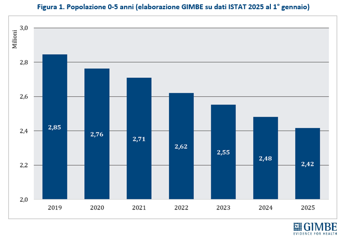 Il progressivo calo delle nascite sta modificando in modo significativo la platea di assistiti dei PLS. I dati ISTAT documentano una costante riduzione dei bambini della fascia 0-5 anni, per la quale l’iscrizione al PLS è obbligatoria: tra il 1° gennaio 2019 e il 1° gennaio 2025 si contano circa 430 mila potenziali assistiti in meno per i PLS (figura 1). “Di conseguenza nello stesso periodo – osserva il Presidente – il crollo delle nascite ha ridotto, su scala nazionale, il fabbisogno di PLS di oltre 500 unità in soli 6 anni”. Nel 2023 si sono registrati in Italia 379.890 nuovi nati, mentre 570.894 adolescenti hanno compiuto 14 anni. Considerando che il 57,5% della fascia 6-13 anni risulta ancora iscritto ai PLS, si stima che 328.264 assistiti siano transitati dai PLS ai MMG, a fronte di quasi 380 mila nuovi nati iscritti ai PLS. Il saldo comporta un incremento netto di oltre 50.000 assistiti per i PLS, con un conseguente aumento del carico assistenziale.